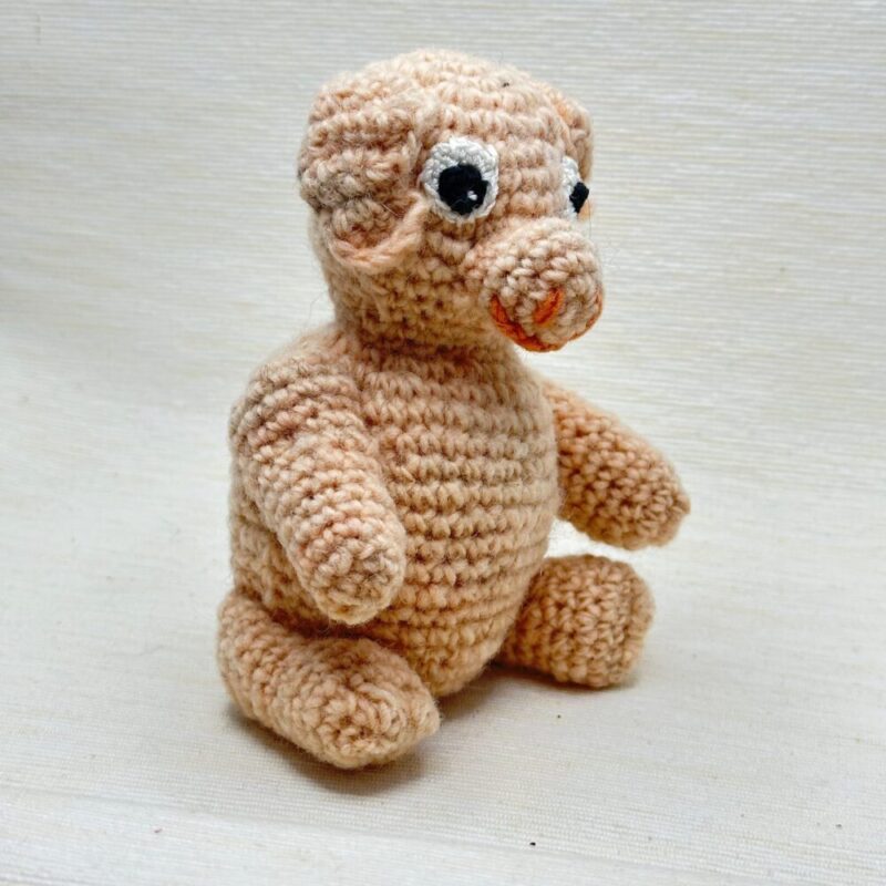 Dieses rosa Schwein wurde von mir nach eigenem Entwurf aus selbst gesponnener und gefärbte Schafwolle gehäkelt.
